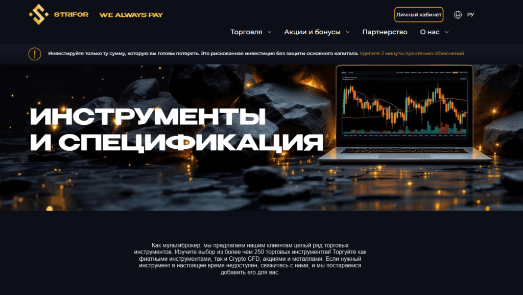 Итак, что же видит потенциальный клиент? Официальный сайт Strifor – это, безусловно, качественно сделанный ресурс. Современный дизайн, интуитивно понятный интерфейс, все на русском языке. Сразу видно, что над проектом работали профессиональные маркетологи и веб-разработчики. Вход в личный кабинет организован стандартно, ничего не предвещает беды. Компания позиционирует себя как прогрессивный форекс-брокер, предлагающий доступ к торговле валютами, индексами, сырьевыми товарами и криптовалютой. Ключевые посылы – это технологичность, надежность и клиентоориентированность.