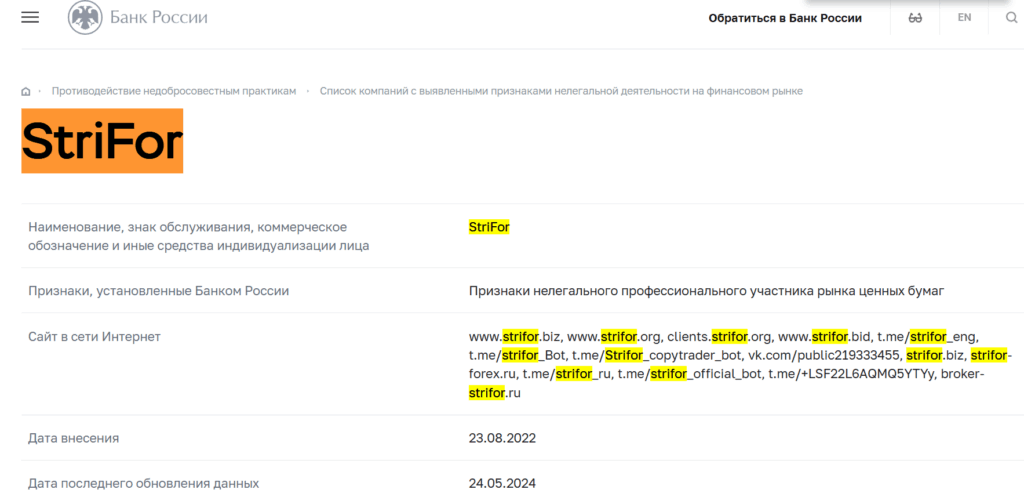 - Деятельность Strifor НЕЛЕГАЛЬНА с точки зрения главного финансового регулятора России.